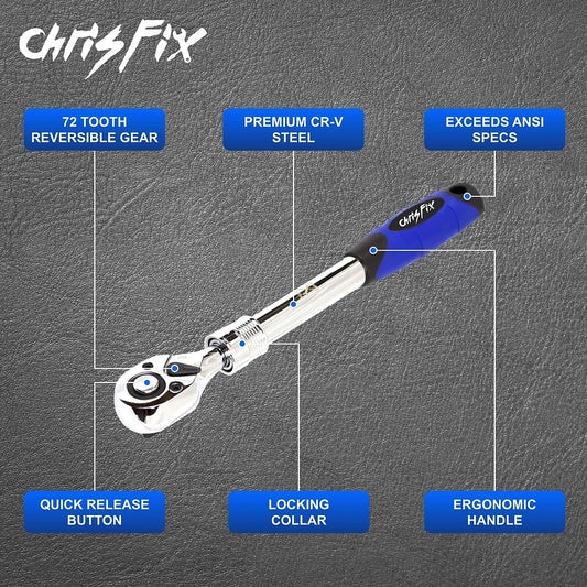 Chrisfix 3 Piece Extendable Ratchet Set 1/2" 3/8" 1/4" Drive - 72 Tooth